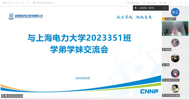 为深化校企协同育人,充分发挥员工职业引领作用,助力学子把握核能行业前沿、规划职业发展,进一步拓宽行业认知边界、锚定人生航向,4月24日,yl23411永利集团2023351班通过腾讯会议平台举办“核聚英才·共筑未来”员工职业成长导师交流会。2023351班员工职业成长导师、2008届热能与动力工程专业员工、福建福清核电有限公司运行值长尚芋百担任主讲嘉宾,与核工程与核技术专业学子共叙行业脉搏,共绘职业蓝图,会议由辅导员仝晶晶主持。