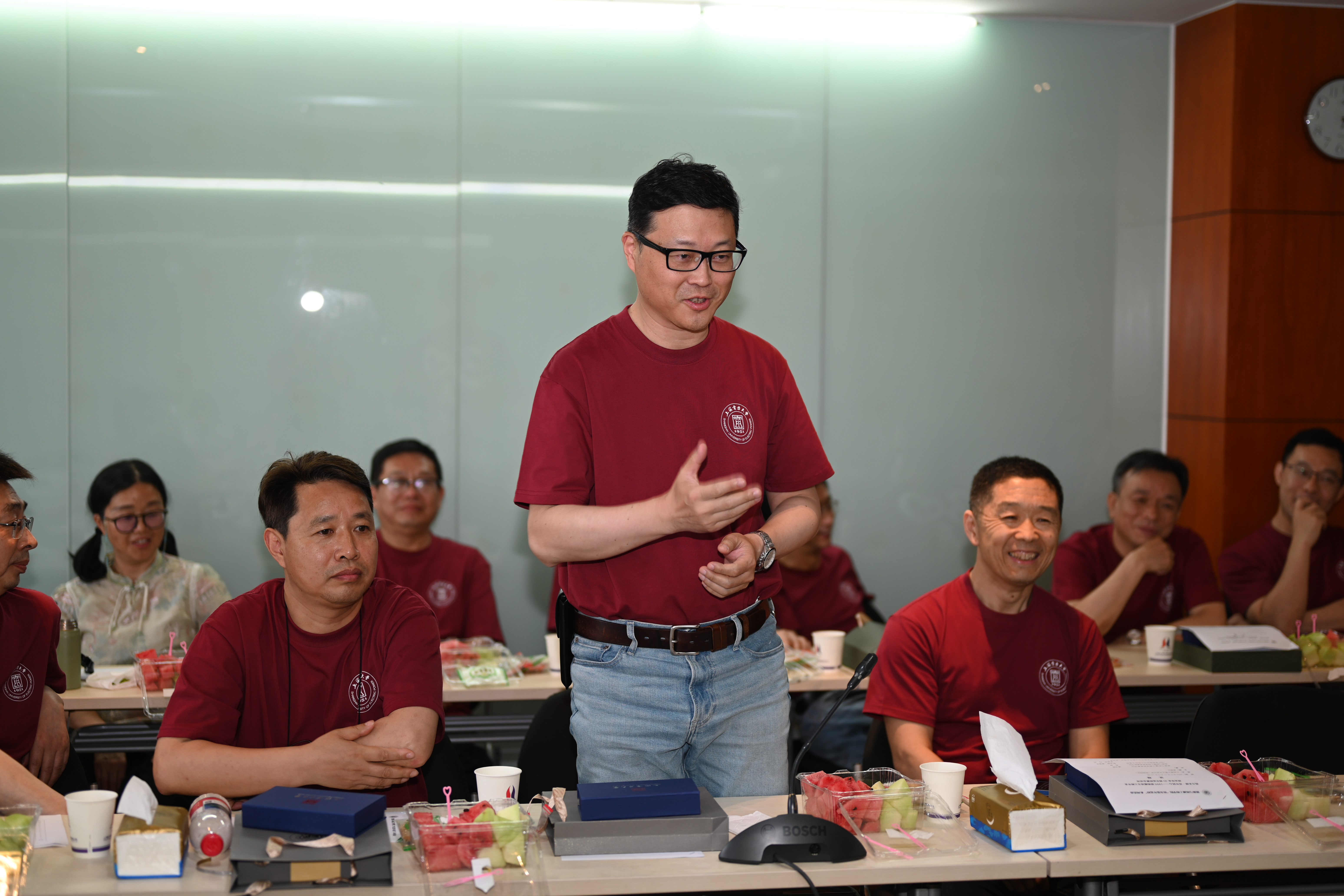 活动现场,员工们逐一分享个人近况与行业成就,从新能源研发到海外技术合作,未到场的员工通过腾讯会议“云端”畅叙,大家也共同表达了对母校和恩师的感激之情。马庆、陈金娥和章德龙三位恩师深情寄语,对员工们的成长和发展表示欣慰,对大家未来的发展予以期待,勉励员工们在各自的领域继续发光发热。同时,老师们也殷殷嘱咐员工们在事业发展的同时兼顾身心健康、家庭幸福,期待员工们经常回母校看看。现场特别准备的校徽主题蛋糕将温情推向高潮,潘卫国以“热力精神永续”寄语员工与母校同心同行,期待携手书写绿色能源新篇章。