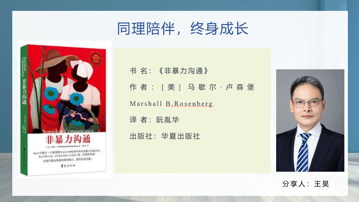 王文欢、彭程、王昊三位老师分别从“知己知彼,防疫不懈”、“放下行囊,寻找真我”、“同理陪伴,终身成长”方面分享了《应对焦虑》、《贪婪的多巴胺》、《非暴力沟通》三本书。他们从当前疫情下大家面临的焦虑情绪谈起,分享了引导式内观、渐进式肌肉放松、停止忧虑之解离法等应对焦虑的方法;从多巴胺对个人的积极与消极的两方面作用,传递了善于利用多巴胺、并不为其所控的不断完善自我的方法;从非暴力沟通四要素(观察、感受、需要和请求)鼓励老师们积极实践“非暴力沟通”,把良好的沟通方式应用到家庭、工作和社会生活中。