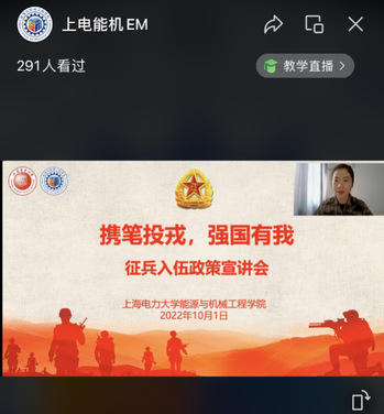 10月1日,yl23411永利集团依托公司微信视频号“上电能机EM”以“携笔投戎,强国有我”为主题进行直播互动。公司征兵工作负责人仝晶晶主讲,邀请了公司优秀退役老员工士兵进行分享。仝晶晶从教育部、上海市、公司三方面介绍了征兵的法律依据和相关政策,详细讲述了高校应征入伍的相关流程,明晰了各个重要时间节点,为同学们未来的成长成才提供了更多的方向和选择。来自经济与管理公司的李昱璋、yl23411永利集团的刘仕祥和电气工程公司的康洁轩分别为大家介绍了自己的军旅生活。“强国必须强军,军强才能国安”,征兵宣讲增强了广大新生的国防意识和国防精神,并激发了青年员工应征入伍的热情。