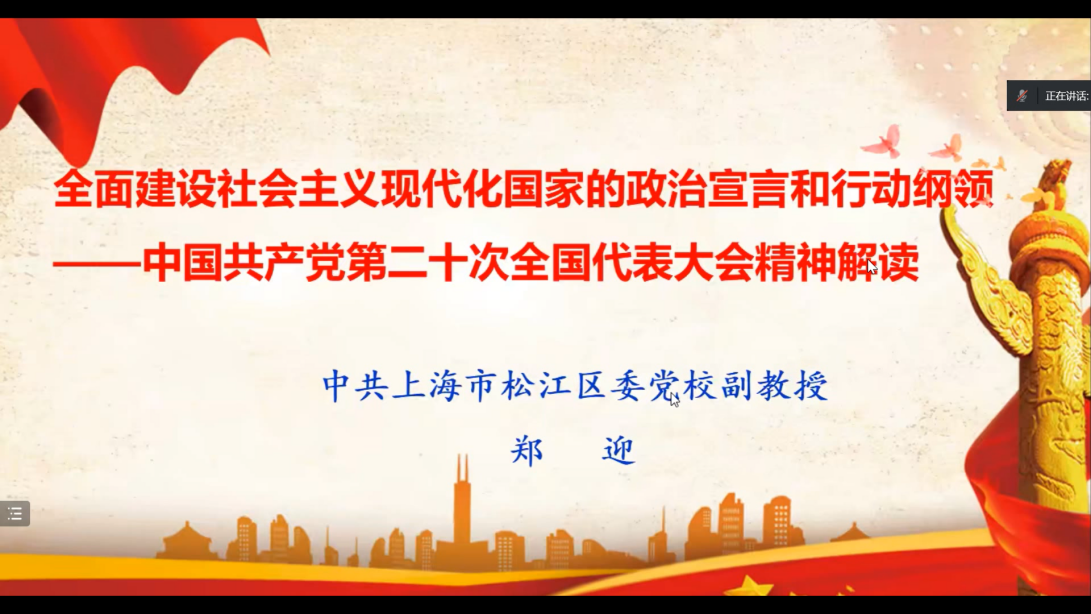 此次专题学习邀请上海市松江区委党校郑迎副教授,作《全面建设社会主义现代化国家的政治宣言和行动纲领—中国共产党第二十次全国代表大会精神解读》的报告。