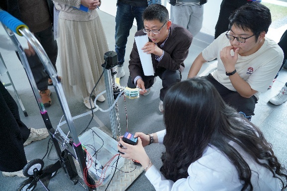 随后,所有参赛团队逐一进行路演,评委们根据评审规则和要求,认真聆听每个团队的作品设计理念、制作原理和整体介绍,同时观看了作品的实物演示。围绕“智能农业”与“低碳生活”的比赛主题,参赛团队设计了诸如“摘苹果机械臂”“机械松鼠”“实用应用无人机”等许多新颖奇妙与实用的作品,获得现场老师和同学们的好评。同时,评委们也针对作品的设计和制作提出建设性的指导意见,帮助各参赛团队在后期更好地进行作品的完善和提升,活动现场气氛空前热烈。