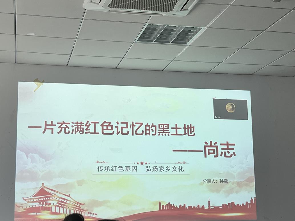 孙雪围绕“北国雄狮”赵尚志、“红枪白马”赵一曼、“抗联名城”尚志市三个版块来介绍的家乡文化。她首先介绍了民族英雄赵尚志和赵一曼两位同志的伟大事迹,他们不怕牺牲,坚定不移的革命信念再一次让在场的每一个人受到了触动,他们的光辉形象和英勇事迹永远留在人们的心中,激励我们要继承革命传统、热爱祖国、热爱党。最后孙雪同志又介绍了尚志市的历史文化与红色景点。