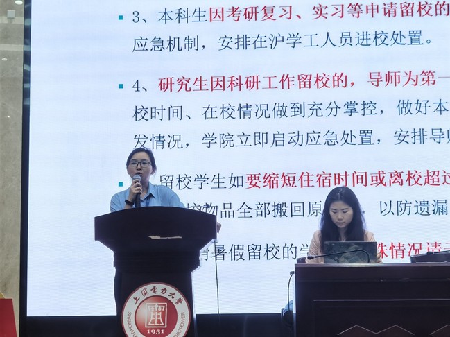会上,周婷以“安全第一、节能减排、便于管理”为原则,就暑期留校的安排和情况进行了详细的说明,向同学们提出以下要求。第一,加强安全防范意识。在人身安全、交通安全,财产安全,饮食安全,用电安全,实验室安全等方面要多加注意。第二,加强离校报备意识。因不同原因留校的同学,长时间离校要及时和辅导员和相关负责老师报备,以便及时掌握同学们的个人安全情况。第三,充分利用暑期实践充实自我。无论是考研科创还是就业实习,同学们应该充分利用好暑期的空余时间,进行好细致的规划,以锻炼自身能力,开拓自身眼界。最后,仝晶晶就公司的食堂、教室、图书馆开放时间等为大家进行了详细介绍,以便同学们及时了解。