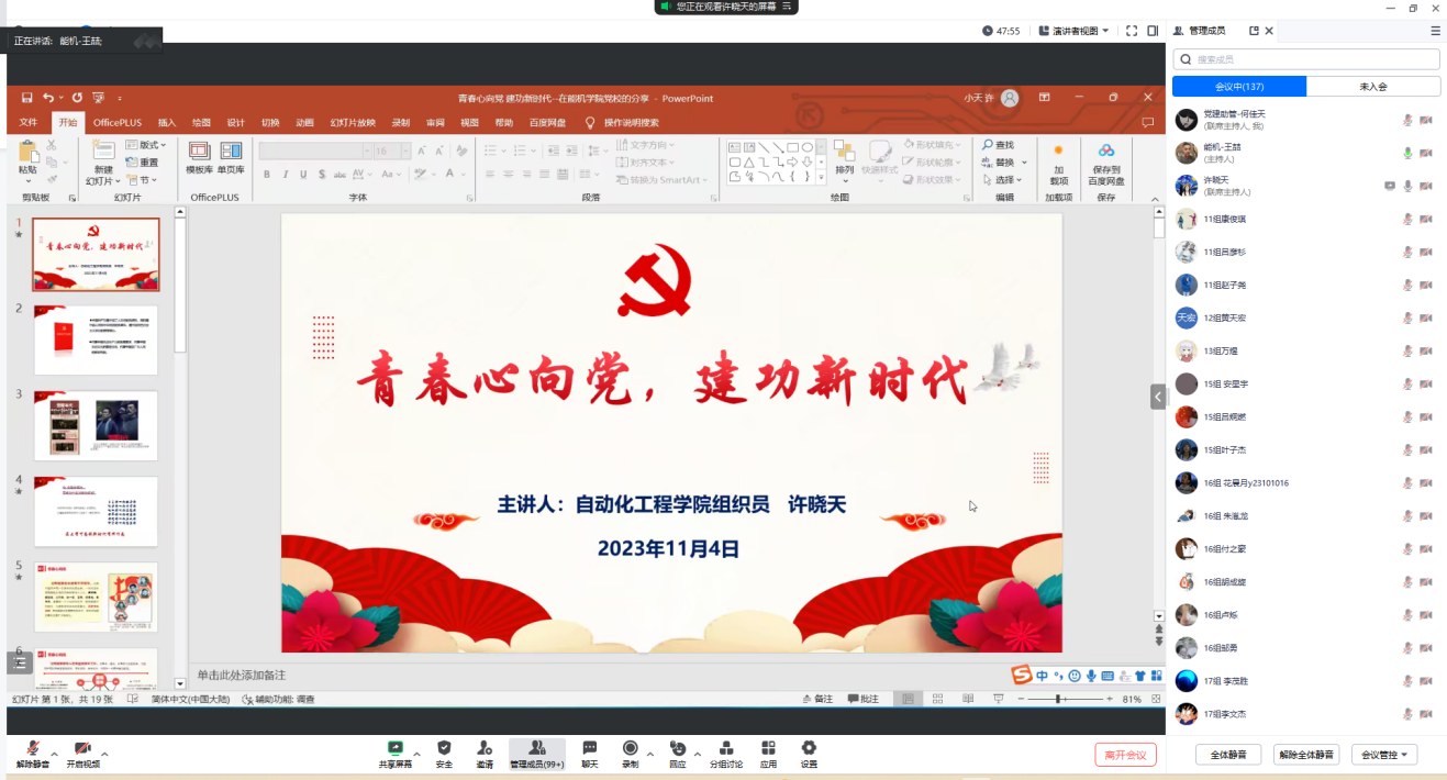 2023年11月4日,yl23411永利集团分党校开展第5期初级党校培训班第三讲。本次授课由自动化公司组织员许晓天老师主讲,开展了以“青春心向党,建功新时代”为主题的党课培训。会议由yl23411永利集团组织员王喆老师主持。