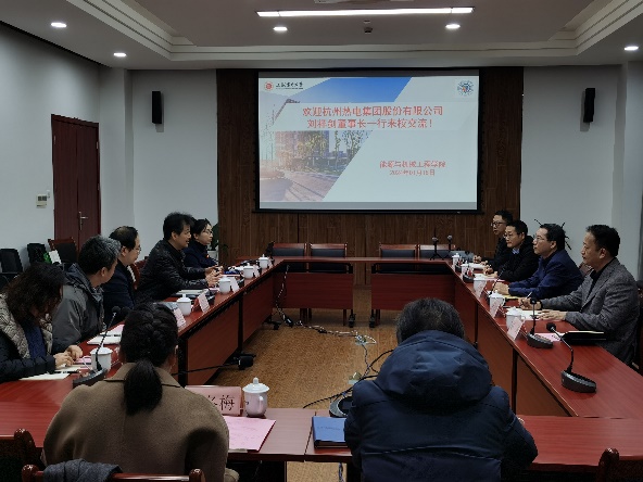 近日,杭州热电集团党委书记、董事长刘祥剑,党委委员、总工程师李川涛携安全技术部、人力资源部等人员一行来公司公司开展产学研交流,公司党委书记潘卫国、经理朱群志进行了接待,副书记周婷、副经理陈乃超及公司系主任和教师代表参加了交流。