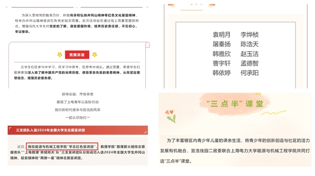 团队自入选以来,得到校团委、公司党委及团委的大力支持,“星火之炬传承井冈山精神,点亮新时代理想光芒”为主题,开展20余场次宣讲活动,10余种活动形式,覆盖团支部、班级、社团、园区、社区、中小学等近2000余人次,受到校内外推送宣传15次,产生了良好的宣传效果,受到校内外师生一致好评。在此过程中,宣讲团逐渐形成了“以学铸魂,以干践行,学思践悟”的总方针,以点带面,纵深发力,让井冈山精神绽放出跨越时空的耀眼光芒。
