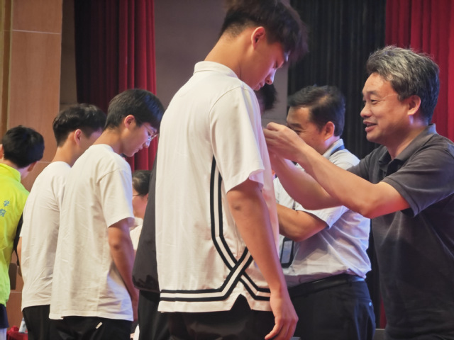 主席台领导和嘉宾为新生代表们佩戴院徽,鼓励同学们秉承“扎实、敬业、明理、奉献”的院训,踔厉奋发,勇毅前行,为双碳目标贡献青春力量。